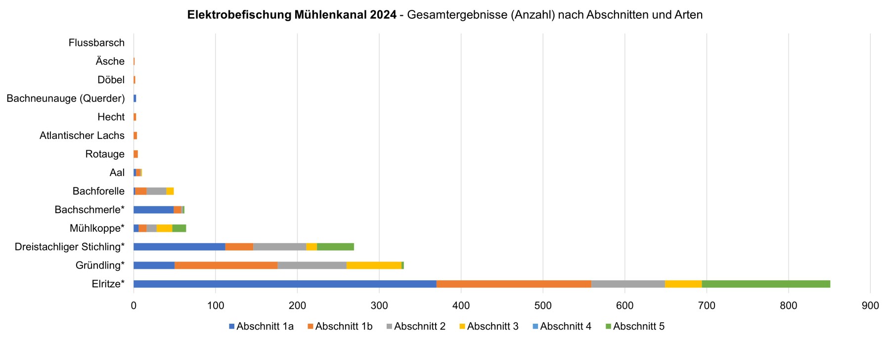 Folgende Galerie zeigt die Gesamtergebnisse der bisher durchgeführten Befischungen aufgeschlüsselt nach Arten und Abschnitten: