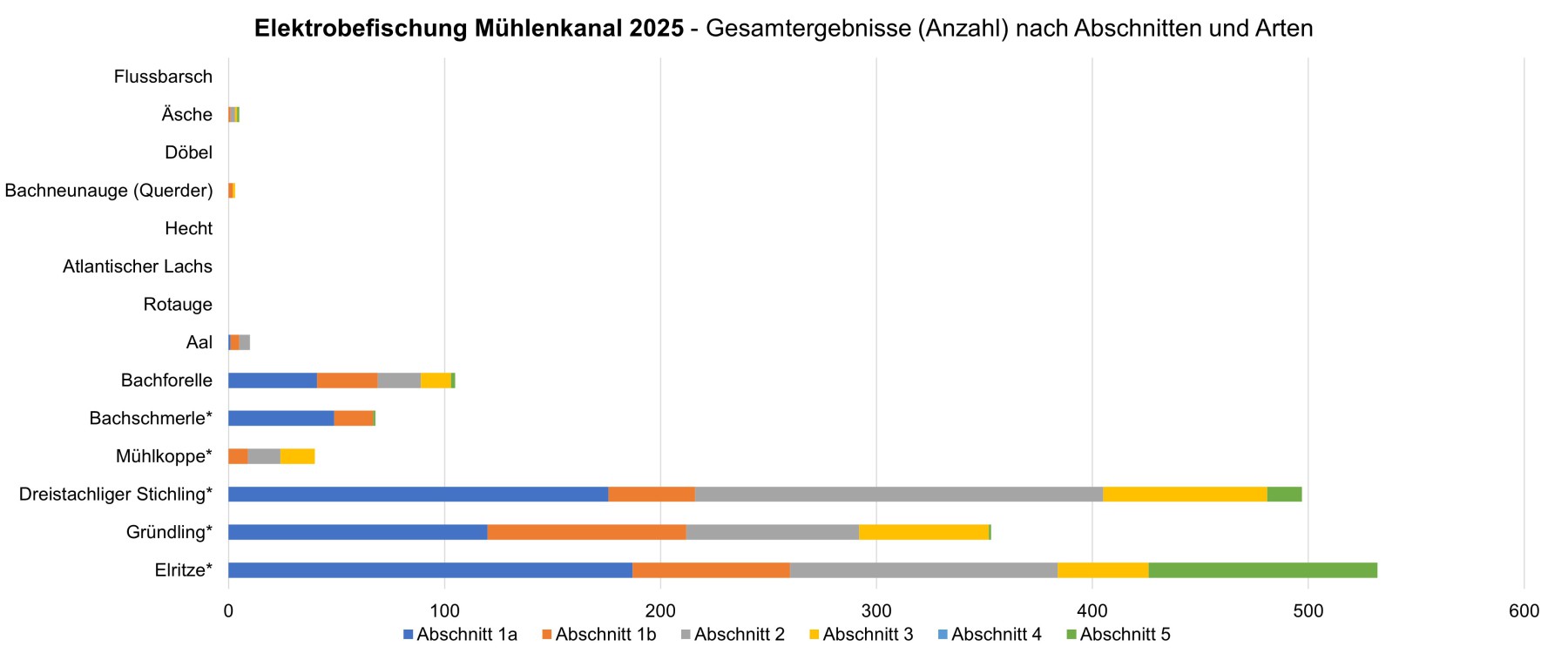 Folgende Galerie zeigt die Gesamtergebnisse der bisher durchgeführten Befischungen aufgeschlüsselt nach Arten und Abschnitten: