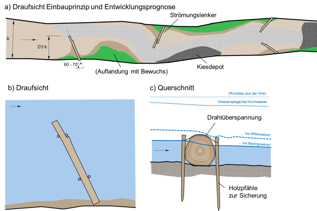- 21 Stämme aus Eschenholz als Strömungslenker, davon 19 einseitig inklinant und zwei beidseitig inklinant, sowie
