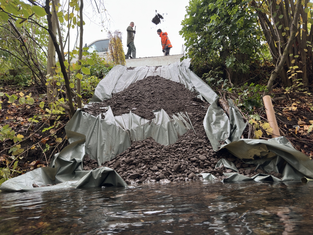 Für den Einbau des Sohlensubstrats aus der Ilme kam eine robuste Kunststoffplane zum Einsatz, die an den gewählten Stellen auf das Ufer gelegt und auf der das Material zum Wasser heruntergeschüttet wurde. Eingebaut wurde der Kies als vom Ufer zur Sohle flach geneigte Bank, in der Regel in Kombination mit einem Strömungslenker.
